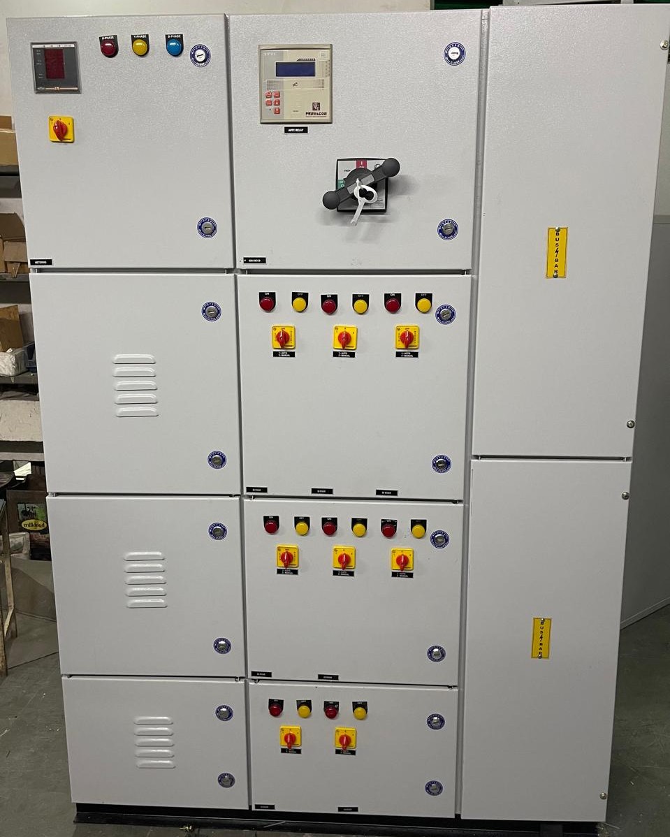 The panel in the image is a floor-mounted, metal-clad unit with a clean and organized front fascia featuring multiple compartments, rotary switches, MCBs, and indicator lights for monitoring and control.